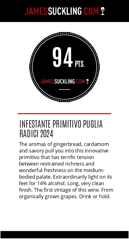 Il Primitivo Radici 2024 entra nelle classifiche di JamesSuckling.com con uno score che lo piazza tra i migliori vini pugliesi.